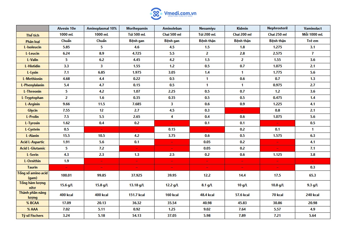 Trong trường hợp bệnh nhân bị bệnh nặng và không thể hấp thụ dinh dưỡng qua đường tiêu hóa, amino acid có thể được cung cấp dưới dạng dung dịch truyền amino acid hoặc được kết hợp với glucose và lipid trong các sản phẩm phối hợp (có thể được đựng trong túi 3 ngăn)....Read More